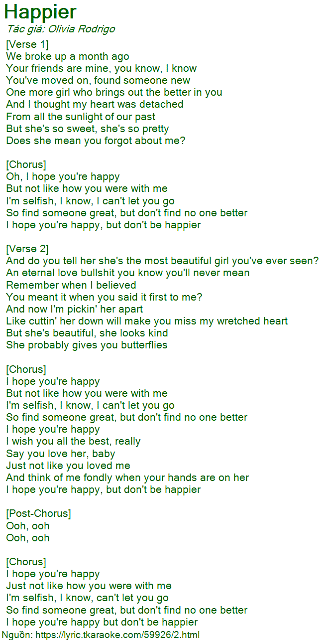 Subscribe and press (🔔) to join the Notification Squad and stay updated with new uploads Listen to SOUR out now: - Follow Olivia Rodrigo: - - - Follow TheNewVibe: - business inquiries: - 📷 Wallpaper: - ©️If any producer or label has an issue with this song or picture, please get in contact with us and we will delete it immediately. Lyrics: We broke up a month ago Your friends are mine You know I know you've moved on Found someone new One more girl who brings out the better in you And I thought my heart was detached From all the sunlight of our past But she's so sweet She's so pretty Does she mean you forgot about me? Oh, I hope you're happy But not like how you were with me I'm selfish, I know I can't let you go So find someone great but don't find no one better I hope you're happy but don't be happier And do you tell her she's the most beautiful girl you've ever seen? An eternal love bullshit you know you'll never mean Remember when I believed You meant it when you said it first to me And now I'm pickin' her apart Like cuttin' her down, make you miss my wretched heart But she's beautiful She looks kind She probably gives you butterflies I hope you're happy But not like how you were with me I'm selfish, I know I can't let you go So find someone great but don't find no one better I hope you're happy I wish you all the best Really Say you love her, baby Just not like you love me And think of me fondly when your hand's around her I hope you're happy But don't be happier I hope you're happy Just not like how you were with me I'm selfish, I know Can't let you go So find someone great but don't find no one better I hope you're happy but don't be happier Tags Olivia Rodrigo, happier, Olivia Rodrigo happier, happier Olivia Rodrigo, happier Lyrics, Lyrics happier, Olivia Rodrigo happier Lyrics, happier Olivia Rodrigo Lyrics, Olivia Rodrigo Lyrics happier, happier Lyrics Olivia Rodrigo, Lyrics Olivia Rodrigo happier, Lyrics happier Olivia Rodrigo